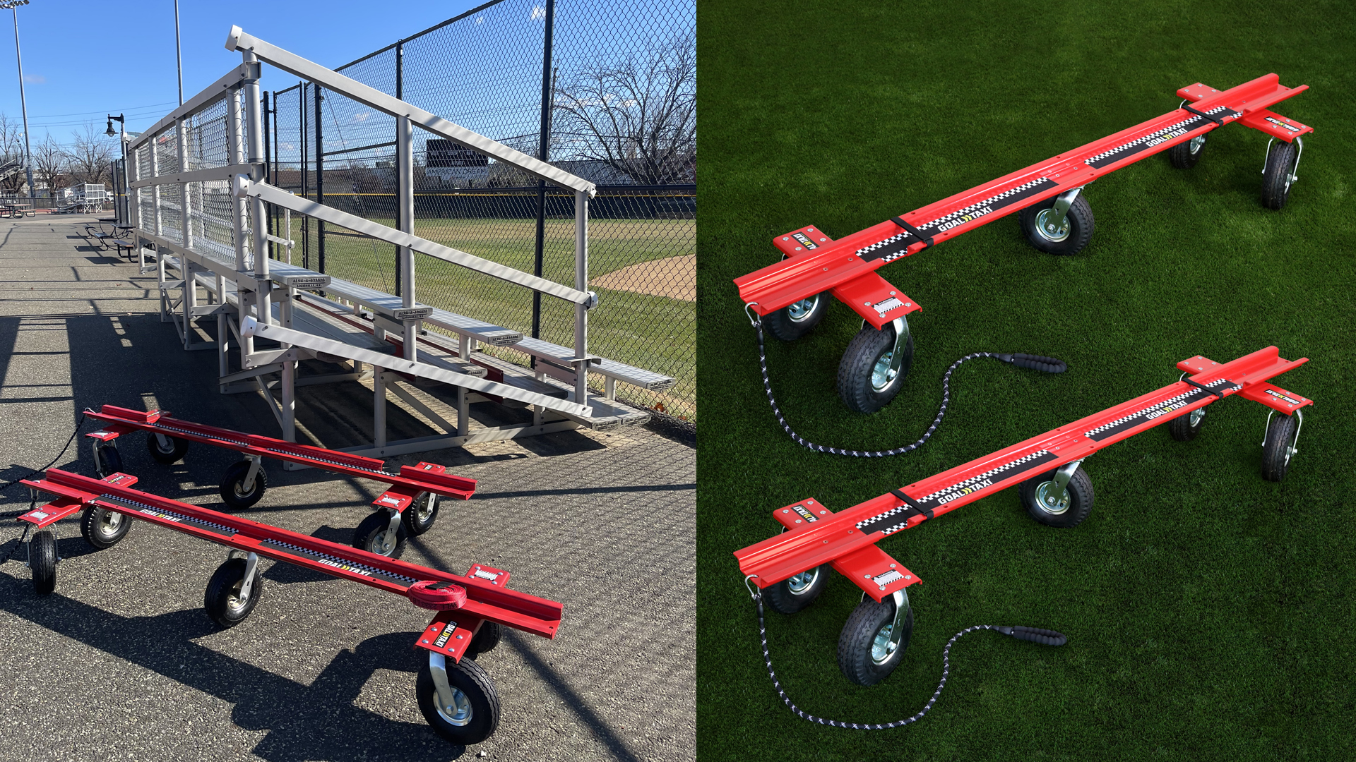 Goal Taxi MAX is the most efficient dolly system for moving every type of sports goal, player benches and shelters, bleachers and more!